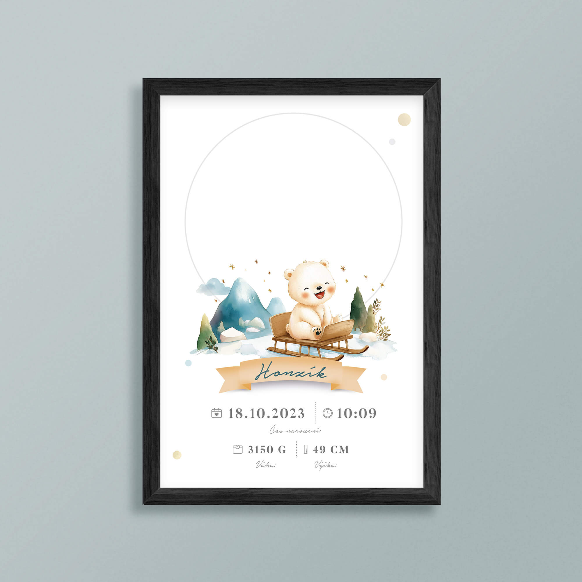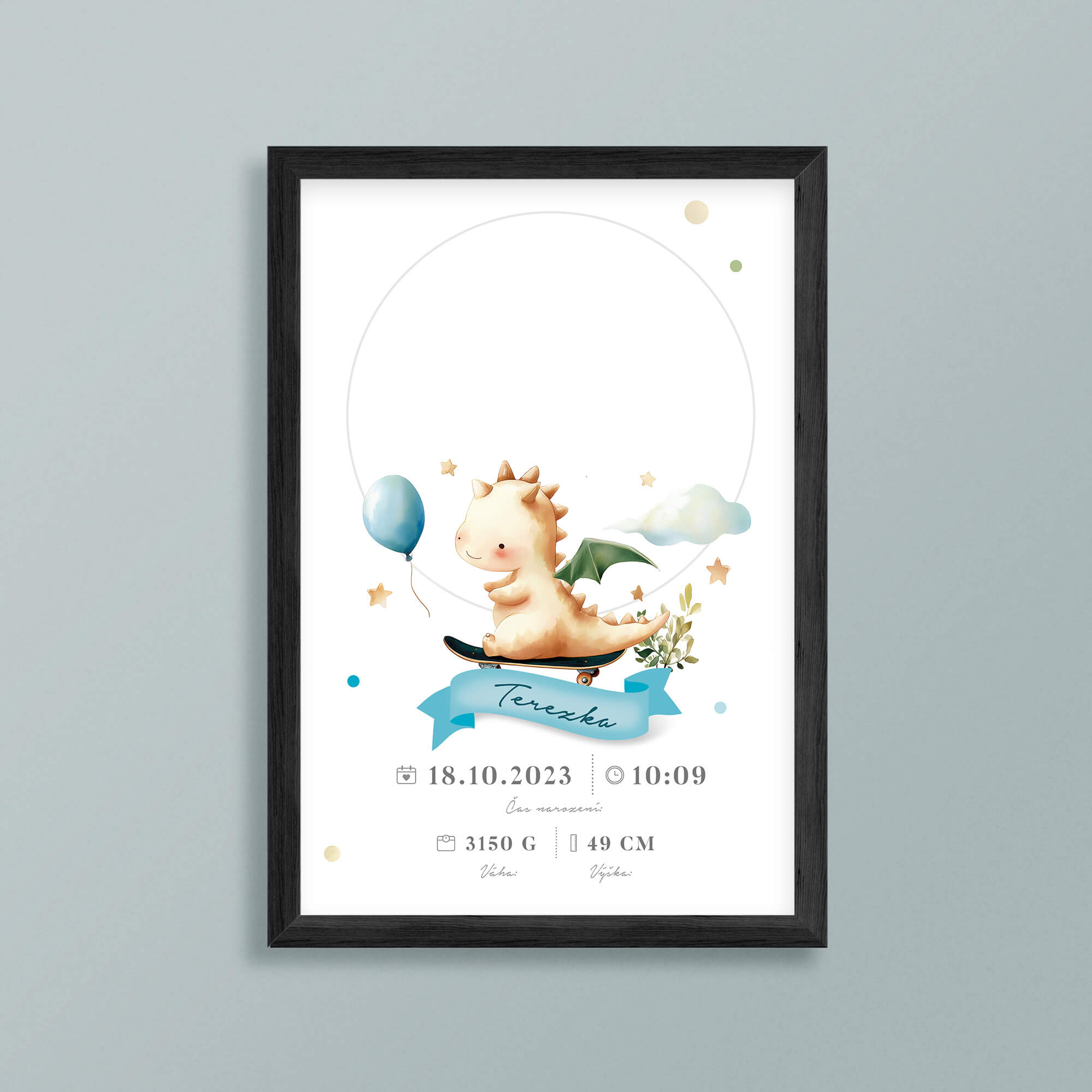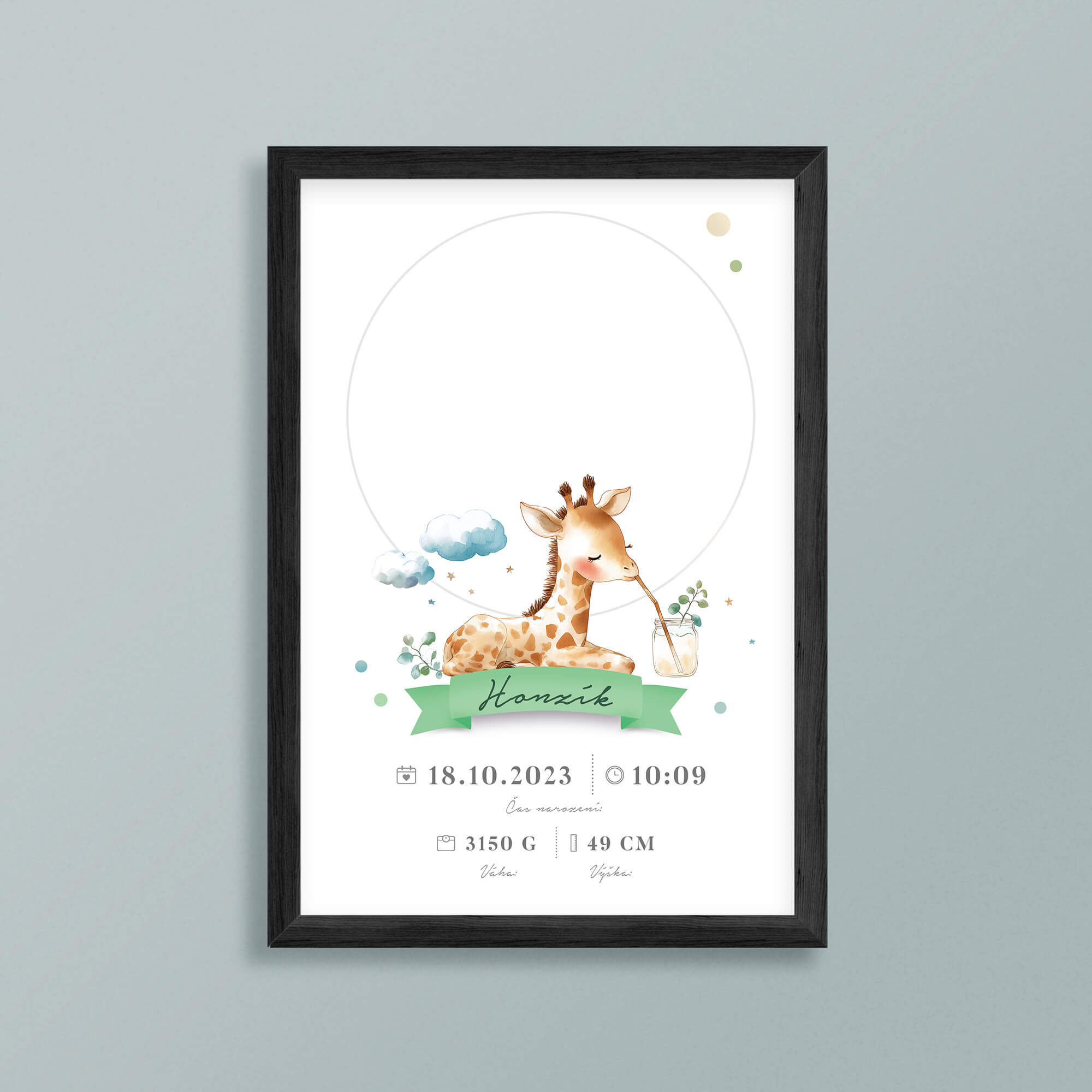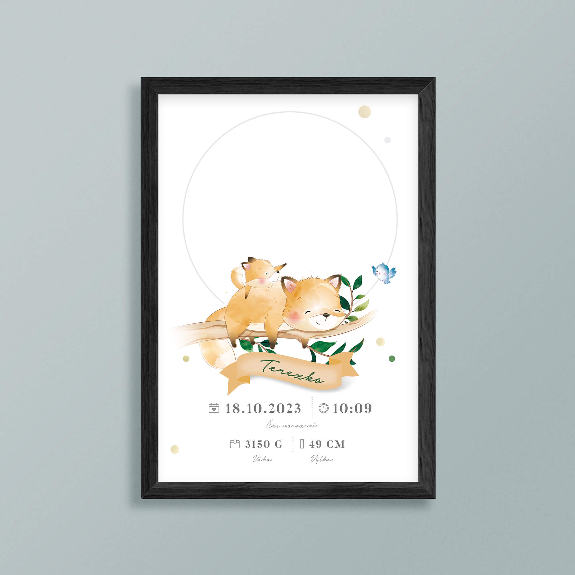 Na prémiový fotopapír vytiskneme vzpomínku na jedno z nejkrásnějších období ve vašem životě a takto si to vždy budete moci připomenout. Na otisky chodidel či ručiček je vyhrazený prostor v jednom ze 8 motivů. Na obraz vám také můžeme vytisknout jméno, váhu, výšku, datum a čas. Obraz je ve velikosti 30×40 cm a možnost výběru ze dvou rámečků – černý a bílý.