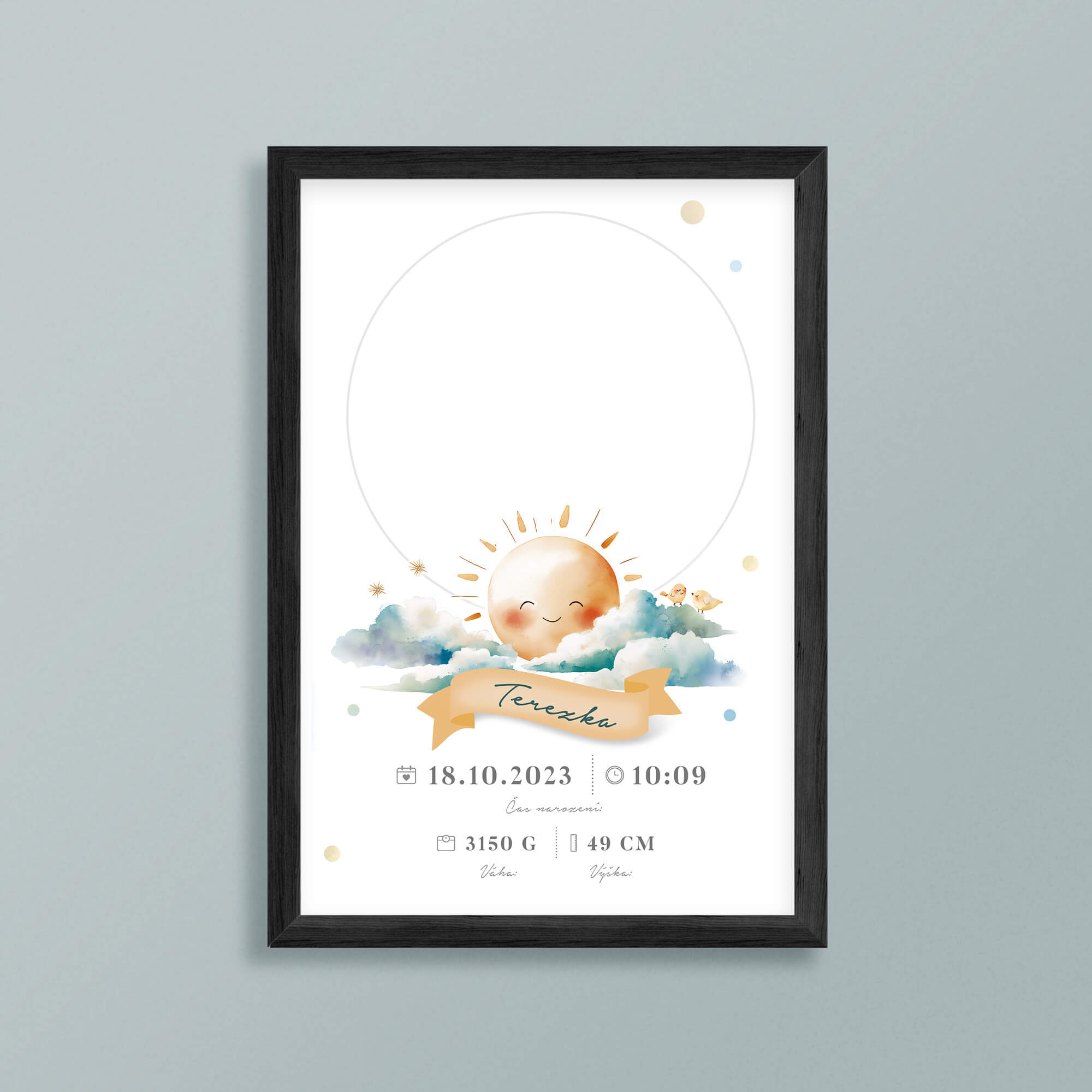 Na prémiový fotopapír vytiskneme vzpomínku na jedno z nejkrásnějších období ve vašem životě a takto si to vždy budete moci připomenout. Na otisky chodidel či ručiček je vyhrazený prostor ve středu plakátu. Na obraz vám také můžeme vytisknout jméno, váhu, výšku, datum a čas. Obraz je ve velikosti 30×40 cm a možnost výběru ze dvou rámečků – černý a bílý.